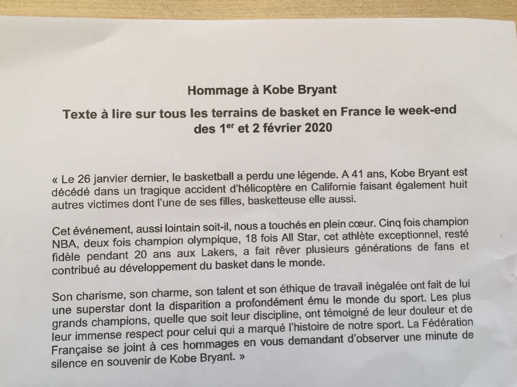 Le Batie Basket en son nom et en celui de la Fédération Française à sa demande a rendu "hommage à Kobe" lors de l'avant match de ses 2 rencontres à domicile. Ainsi, Pierrick en U13 et Pierre en sénior ont pu lire un texte préparé et transmis aux clubs. L'ensemble des présents se sont associer à la minute de silence suivi à l'initiative du BBC d'applaudissements nourris durant 24 secondes ... Un grand moment piognant d'émotions.